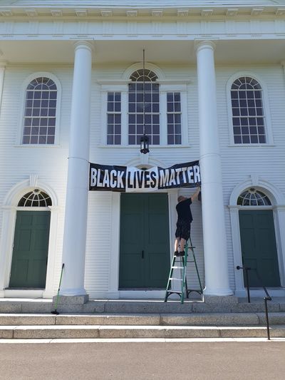 During the 2020 BLM protest movement, we raised our voices among those calling for equity and justice. Mendon, and our church in particular, has a strong and passionate abolitionist history. Our Black Lives Matter banner was hung in honor of that tradition, in support and solidarity with the BLM movement for Social Justice. Even when someone vandalized it and tore it down the community rallied and put it right back up.
